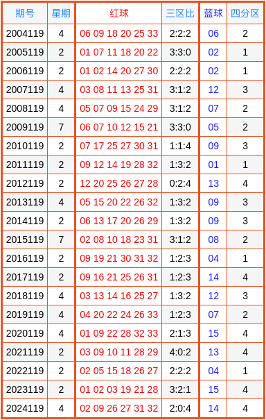 蓝球四区分析,一区(1-4) 二区(5-8) 三区(9-12) 四区(13-16):将历年双色球第119期同期奖号,按四区进行划分统计后发现,在历史同期中,蓝球号码1区开出5个,2区开出5个,3区开出5个,4区开出6个,其中4区表现较热。上期开出03属于1分区。本期看好蓝球开出4区号:14。